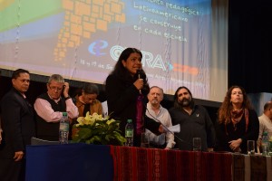 La Secretaria General de CTERA, Sonia Alesso, hizo uso de la palabra para dar apertura al encuentro. “Este Movimiento que impulsamos en el año 2011, lo vamos a defender y vamos a lucha por la escuela pública, los pibes y los trabajadores de la educación de todo el continente”, dijo.