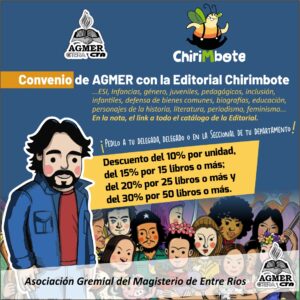 Desde hace años las distintas Secretarías de la CDC de AGMER han definido la compra de libros para el envío a las Seccionales del gremio en la provincia. Nutrimos así las bibliotecas de los departamentos para que las y los docentes puedan acceder a materiales impresos con, por ejemplo, la historia de Abuelas de Plaza de Mayo, de Micaela García, de Norita Cortiñas, de músicos y artistas de nuestro país para dar a conocer sus historias entre las y los más chicos. Muchos de esos materiales fueron encarados por Chirimbote, una editorial independiente que propone una mirada distinta y novedosa de la cultura, sobre todo, para nuestras infancias, adolescencias y juventudes.
