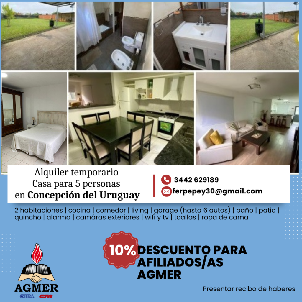 Por convenio de AGMER Seccional Uruguay, se ofrece un descuento del 10% para alojamiento temporario en casa para cinco personas en esa ciudad.