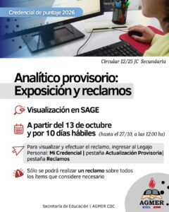 El analítico provisorio estará disponible para visualización y consulta en SAGE, a partir del 13 de octubre de 2025, habilitándose por diez (10) días hábiles (hasta las 12.00 horas del día 27 de octubre de 2025,) el período de reclamos.