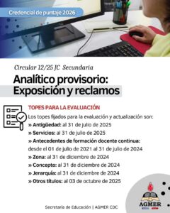 Publicamos para su conocimiento y amplia difusión la Circular 12/25 de Jurado de Concurso de Nivel Secundario, que informa sobre la emisión y puesta en línea (sistema SAGE) del analítico provisorio, correspondiente a la actualización de credencial de puntaje -corte al 31 de julio de 2024-.