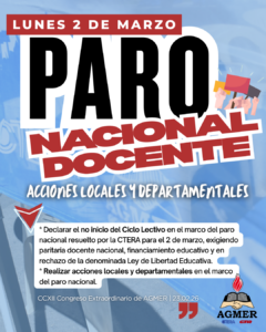AGMER declaró el no inicio del ciclo lectivo este lunes 2 de marzo, cumpliendo el paro nacional que convocó la CTERA. Además, se realizarán acciones sindicales a nivel local y departamental.
