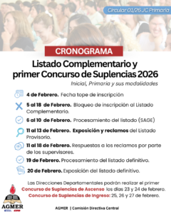 Compartimos para su conocimiento y amplia difusión la Circular 01/26 de Jurado de Concursos de Inicial y Primaria que establece el Cronograma de Listado Complementario y primer Concurso de Suplencias 2026.