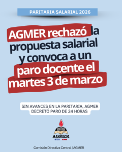 Sin avances en la paritaria, AGMER convocó a un paro docente de 24 horas para este martes 3 de marzo.