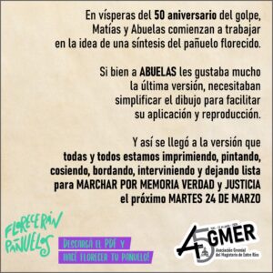 Hacemos propias las palabras del autor cuando dice que “en épocas de ‘desinteligencias artificiales’ despersonalizando el trabajo de artistas y diseñadores, sepamos que hay dibujos con historia y alma…y jamás morirán”, es por eso que difundimos el recorrido que ha dado su “pañuelo florecido” con la esperanza de que el próximo martes su obra intervenida por miles colme las plazas de todo el país y nos acompañe en el grito por NUNCA MÁS.