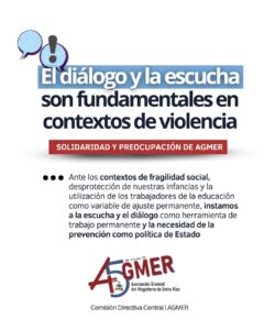 Desde AGMER expresamos nuestra preocupación ante la ola de presuntas amenazas de acciones de violencia, que no son generadas en los contextos escolares, pero que están afectando a docentes, familias, y al conjunto de la comunidad educativa. Manifestamos nuestra solidaridad y llamamos a reflexionar sobre las necesarias acciones para prevenir y acompañar.
